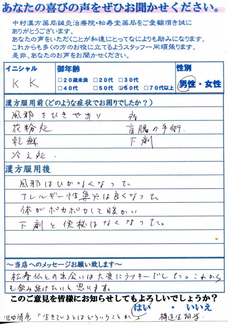 拡大して見る K.K.さん 60代男性 風邪はひかなくなり、アレルギー性ビエンは良くなった 漢方服用前、どのようなことでお困りでしたか? 風邪をひきやすい・痔・花粉症・盲腸の手術・乾癬・下痢・冷え症 漢方服用後、いかがでしょうか? 風邪はひかなくなった アレルギー性ビエンは良くなった 体がポカポカして暖かい 下痢と便秘はなくなった 当店へのメッセージをお願いいたします。 漢方薬との出会いは大変にラッキーでした。これからも飲み続けたいと思います。