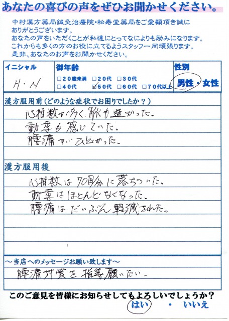 拡大して見る H.N.さん 50代男性 心拍数は70回/分に落ちついた。 漢方服用前、どのようなことでお困りでしたか? 心拍数が多く、脈っも速かった。 動悸も感じていた。 腰痛がひどかった。 漢方服用後、いかがでしょうか? 心拍数は70回/分に落ちついた。 動悸はほとんどなくなった。 腰痛はだいぶん軽減された。 当店へのメッセージをお願いいたします。 腰痛対策を指導願いたい。