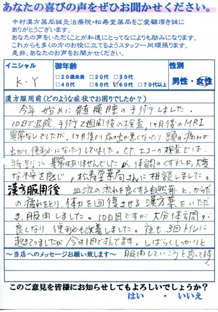 10日で退院、手術で2週間後の検査、1ヶ月後のMRI異常なしでしたが、1ヶ月後より尿の出が悪くなったり頭の痛みが出たり、便秘になったりしていました。CT、エコーの検査では、特別に異常はありませんでしたが、体調のくずれに、大変な不安を感じ、松寿堂薬局さんに相談しました。