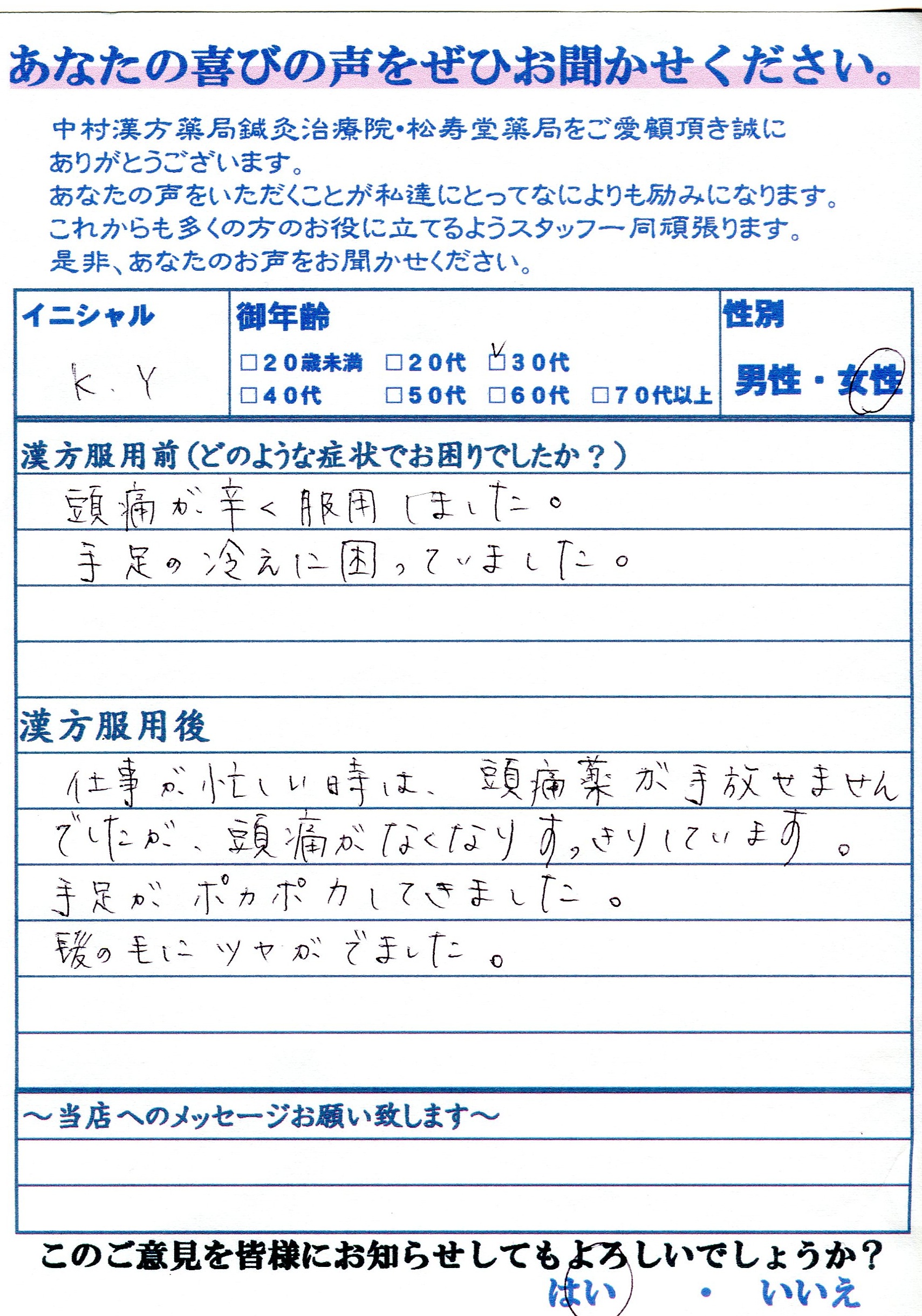 拡大して見る K.Y.さん 30代女性 仕事が忙しい時は、頭痛薬が手放せませんでしたが、 頭痛がなくなりすっきりしています。 漢方服用前、どのようなことでお困りでしたか? 頭痛が辛く服用しました。 手足の冷えに困っていました。 漢方服用後、いかがでしょうか? 仕事が忙しい時は、頭痛薬が手放せませんでしたが、 頭痛がなくなりすっきりしています。 手足がポカポカしてきました。 髪の毛にツヤがでました。