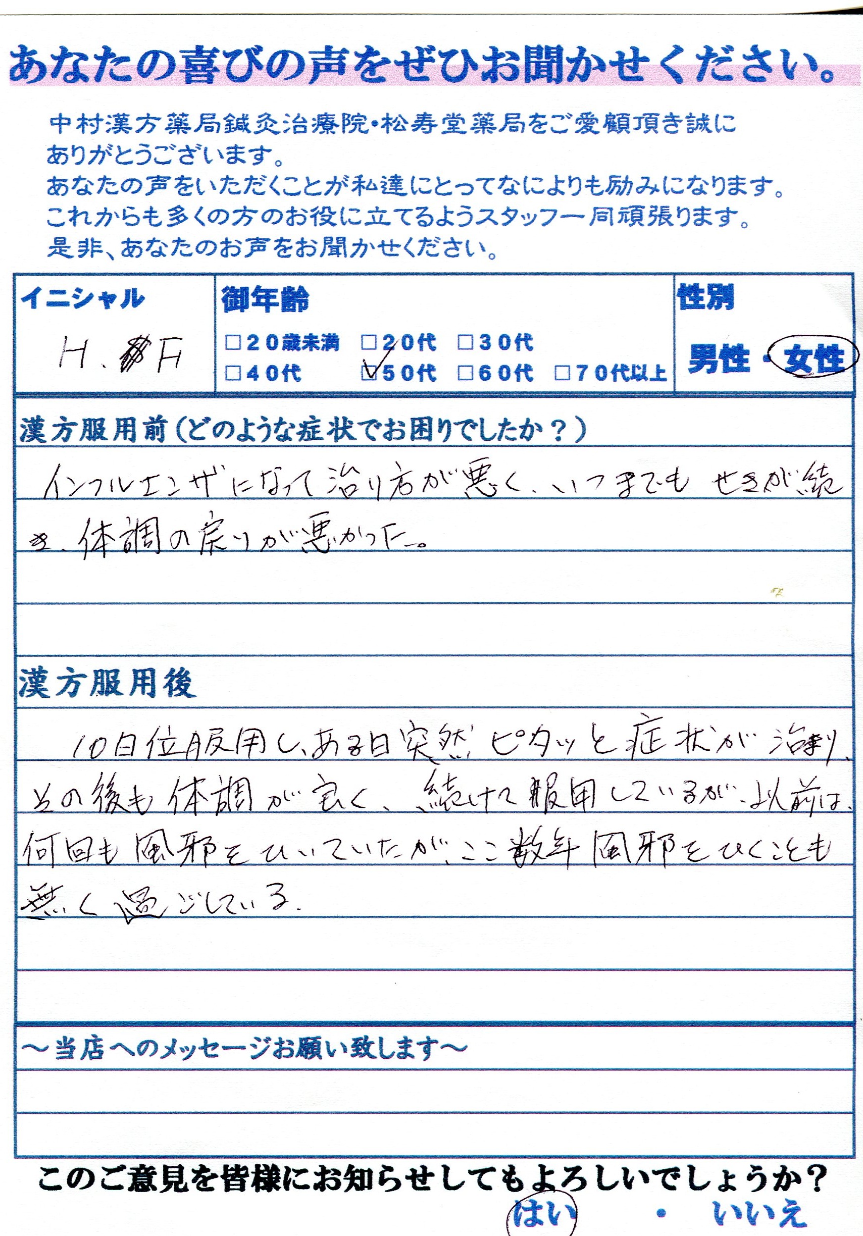 拡大して見る H.F.さん 50代女性 ある日突然ピタッと症状が治まり、 その後も体調が良くなりました。 漢方服用前、どのようなことでお困りでしたか? インフルエンザになって治り方が悪く、いつまでもせきが続き、体調の戻りが悪かった。 漢方服用後、いかがでしょうか? 10日くらい服用し、ある日突然ピタッと症状が治まり、 その後も体調が良く、続けて服用しているが、以前は 南海も風邪をひいていたが、ここ数年風邪をひくことも 無く過ごしている。