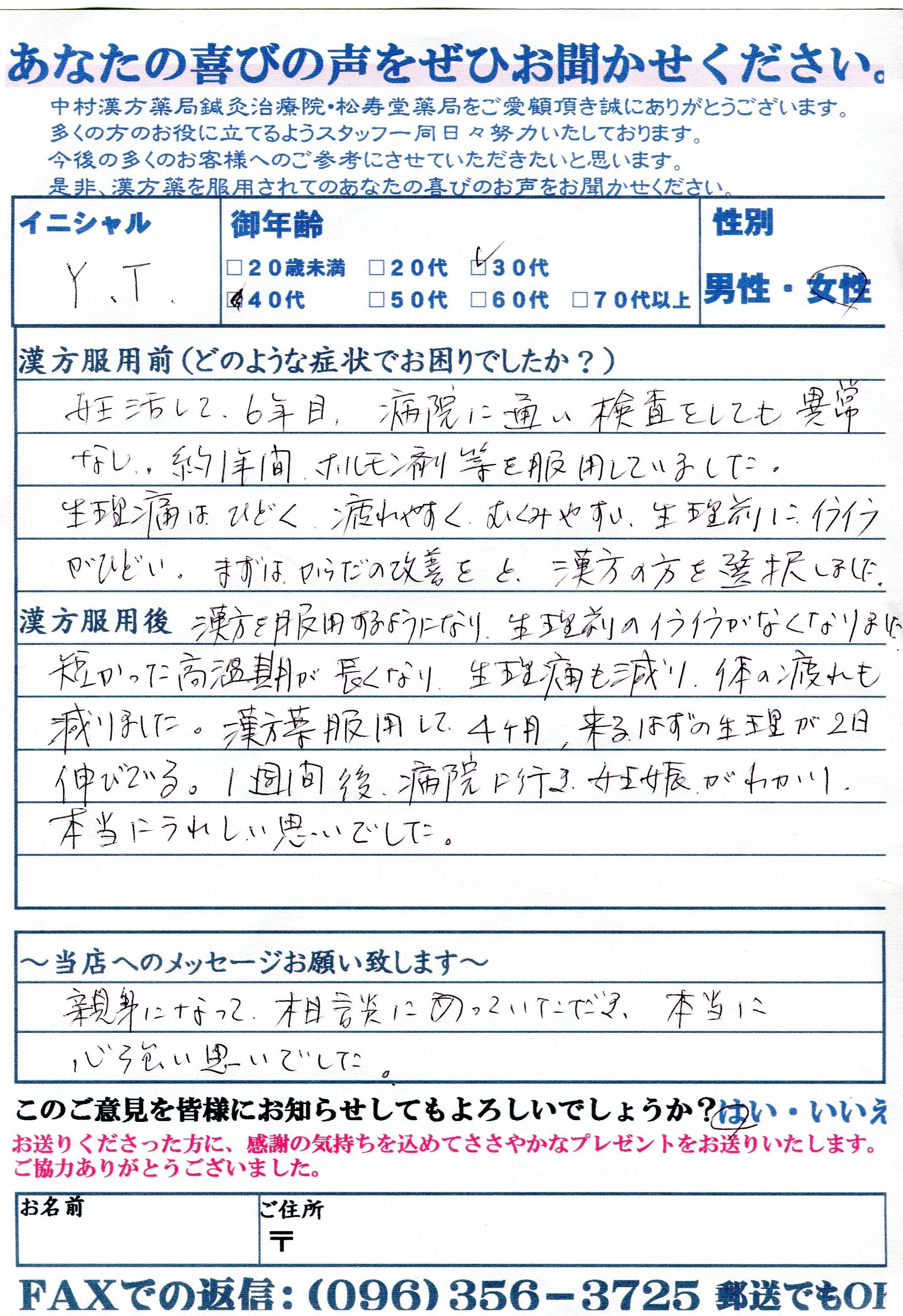 拡大して見る Y.T.さん 30代女性 生理前のイライラがなくなりました。 短かった高温期が長くなり生理痛も減り、からだの疲れも 減りました。 漢方服用前、どのようなことでお困りでしたか? 妊活をして6年目、病院に通い検査をしても異常なし。 約1年間ホルモン剤等を服用していました。 生理痛はひどく、疲れやすくむくみやすい、生理前にイライラ がひどい。まずはからだの改善をと漢方を選択しました。 漢方服用後、いかがでしょうか? 漢方を服用するようになり、生理前のイライラがなくなりました。 短かった高温期が長くなり生理痛も減り、からだの疲れも 減りました。漢方薬を服用して4ヶ月、来るはずの生理が2日伸びている。 1週間後、病院に行き妊娠がわかり、本当にうれしい思いでした。